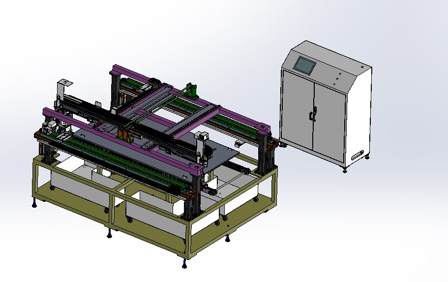 自動(dòng)排版機(jī)的主要功能單元有:玻璃輸送定位系統(tǒng)、抓取行走系統(tǒng)、視覺檢測(cè)系統(tǒng)、電控系統(tǒng)等;通過以上功能單元,實(shí)現(xiàn)了將自動(dòng)串焊機(jī)串焊好的電池串,按照工藝尺寸要求和排版方向順序自動(dòng)排版鋪設(shè)到玻璃(EVA已經(jīng)鋪設(shè))上,組成電池串陣列。玻璃/EVA通過傳輸線傳輸至指定位置,機(jī)械手抓取電池串實(shí)現(xiàn)CCD定位、自動(dòng)旋轉(zhuǎn)、自動(dòng)排版功能。設(shè)備通過同步帶傳輸與自動(dòng)生產(chǎn)線對(duì)接,實(shí)現(xiàn)了自動(dòng)流水作業(yè)。